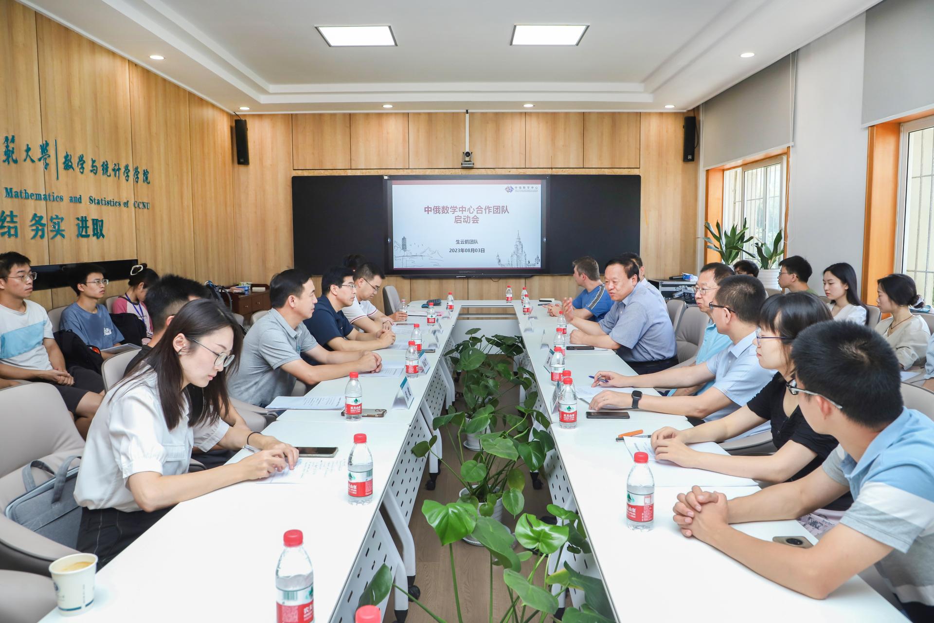 8月3日,中俄数学中心国际合作团队启动会在校举行。中俄数学中心主任、中国科学院院士、北京大学张继平教授,副校长彭双阶,中国科学技术大学陈洪佳教授,美国罗格斯大学郭锂教授,英国兰卡斯特大学Andrey Lazarev教授,吉林大学生云鹤教授,德国哥廷根大学朱晨畅教授出席启动会。会议由数学与统计学学院院长周远扬主持。